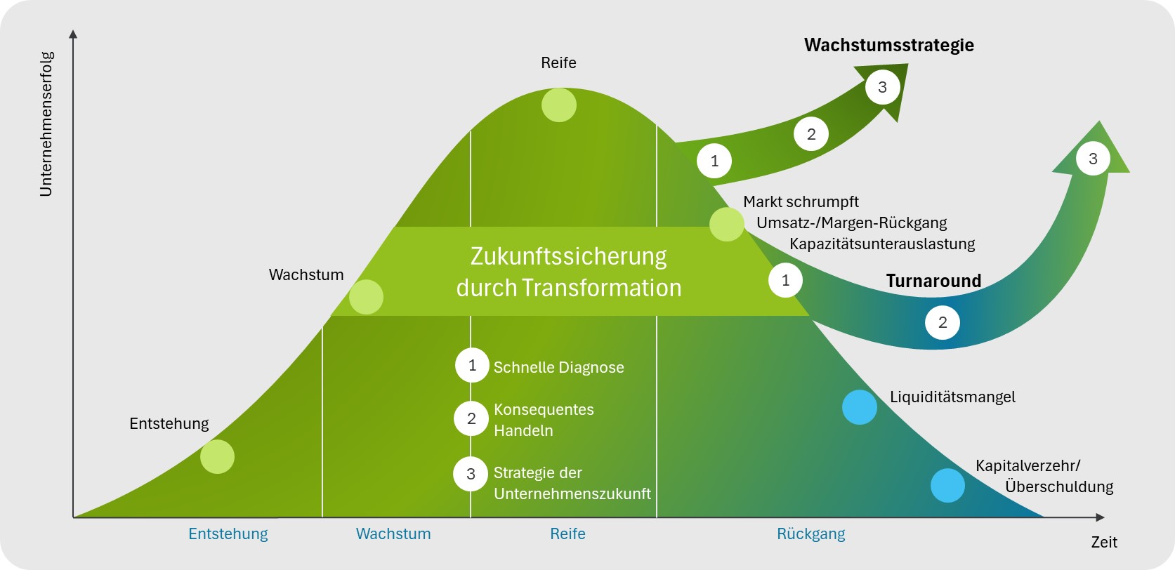 Transformation ist eine kontinuierliche Führungsaufgabe. Sie beginnt idealerweise in stabilen Phasen – nicht erst in der Krise. Auch wirtschaftlich gesunde Unternehmen müssen ihr Geschäftsmodell, ihre Prozesse und ihre Organisation kontinuierlich an veränderte Marktbedingungen und Wachstumsstrategien anpassen.